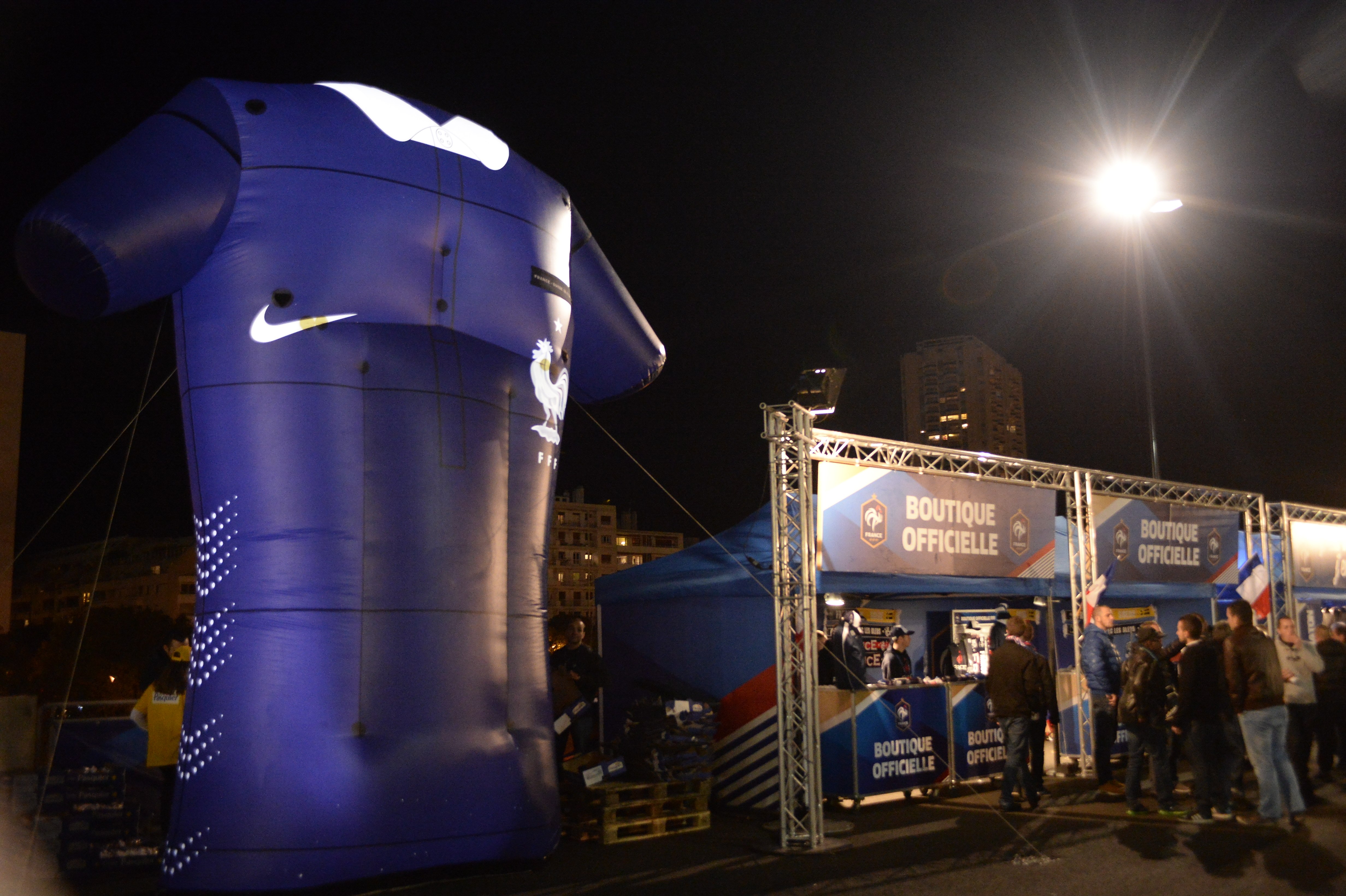 - Des stands et animations gérées à 100% par la FFF : la tente Photomaton pour immortaliser sa présence au match, le Photocall Equipe de France pour poser à côté des joueurs français, les murs des encouragements pour permettre aux spectateurs de choisir des stickers avec des messages de soutien, mais aussi deux maillots gonflables géants et une boutique merchandising proposant de nombreux produits Nike/FFF !