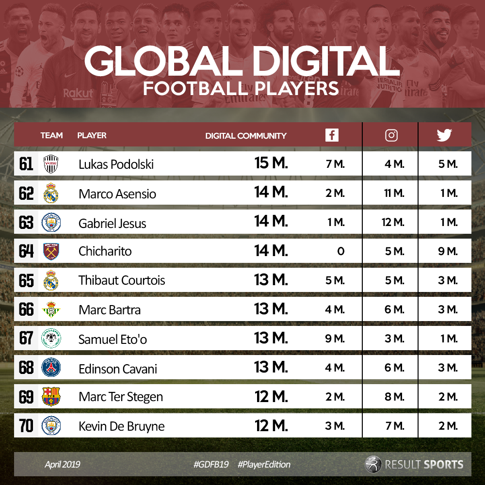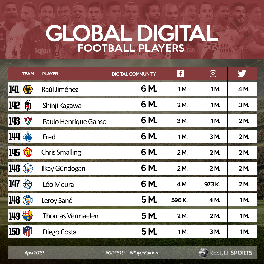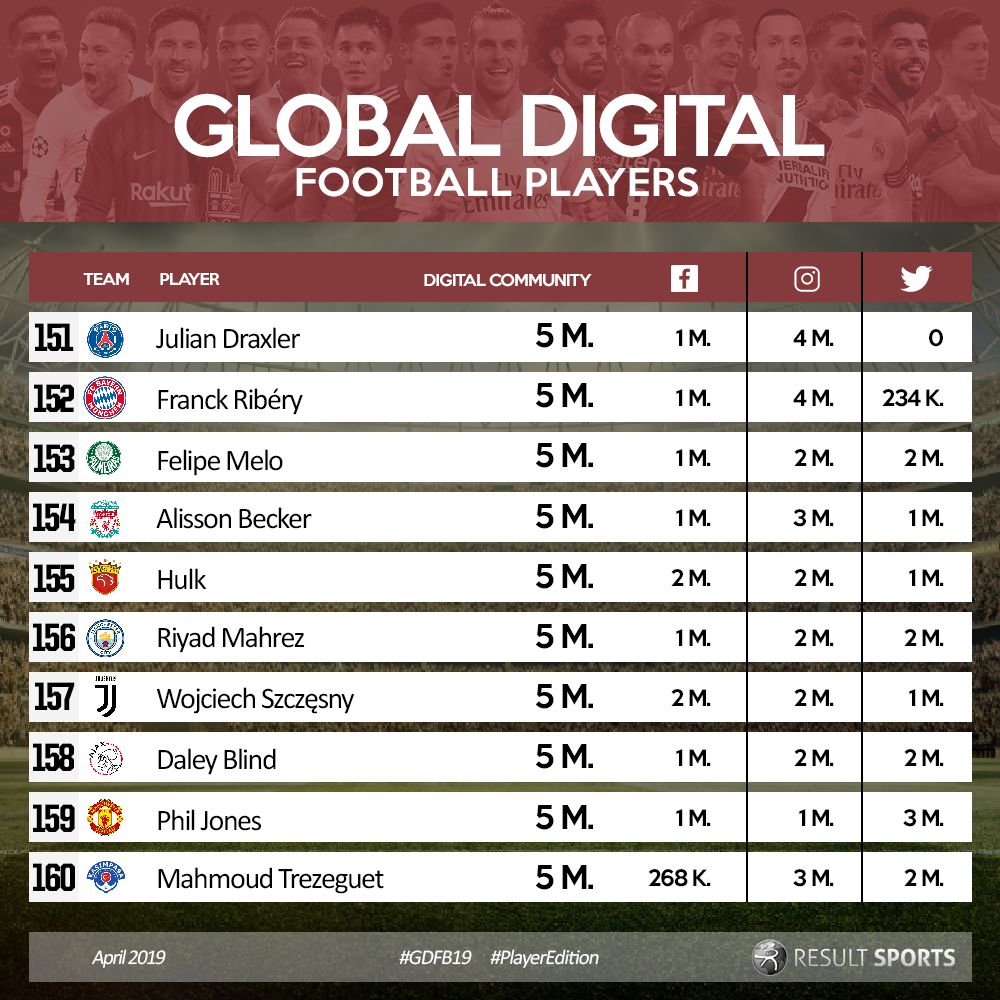 A la première place du classement, on retrouve Cristiano Ronaldo avec une communauté digitale sur Facebook, Instagram et Twitter rassemblant un total de 363 millions de Fans. Le portugais de la Juventus devance Neymar JR avec 217 millions de Fans. Le podium est complété par Leo Messi avec 205M. Notons que l’argentin est absent de Twitter. Le premier joueur français du classement est Karim Benzema (12ème) avec 59 millions de fans sur les 3 réseaux sociaux.