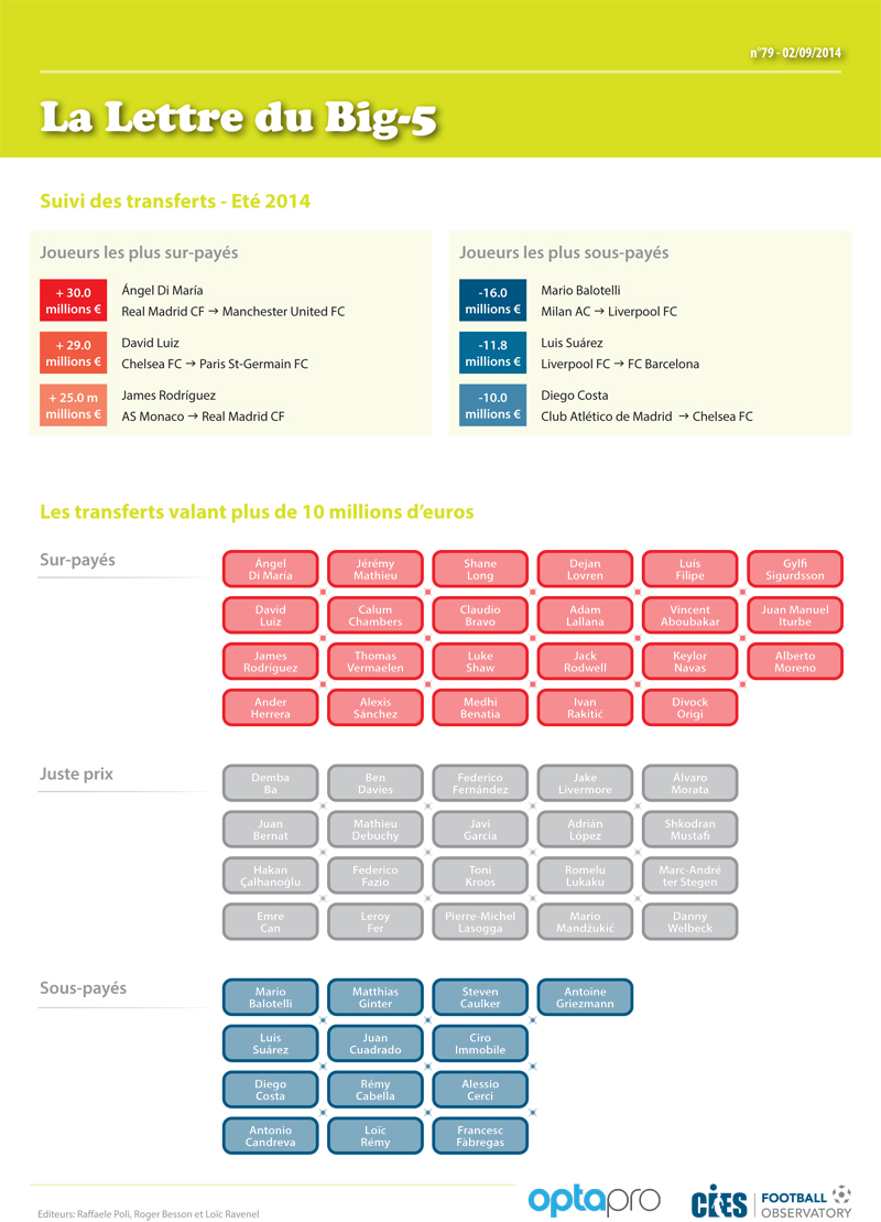 Dans le cas par cas, l’outil présente Angel Di María (Real Madrid vers Manchester United) comme le joueur le plus sur-payé lors de son transfert (+30M€ entre le juste prix et l’argent dépensé). Le joueur du Paris St-Germain David Luiz est second avec +29M€. James Rodríguez, recrue du Real Madrid affiche +25M€. A l’opposé, certains clubs auraient réalisé de bonnes affaires. C’est le cas du FC Barcelone avec Luis Suárez, recruté pour 12 millions d’euros de moins que son « juste prix ». Diego Costa (Chelsea) serait le second meilleur coup du mercato (-10M€). Enfin, l’italien Mario Balotelli aurait été recruté par Liverpool à 16M€ de moins que sa valeur estimé par l’Observatoir du football. Des chiffres à relativiser puisque basés uniquement sur des statistiques sportives.