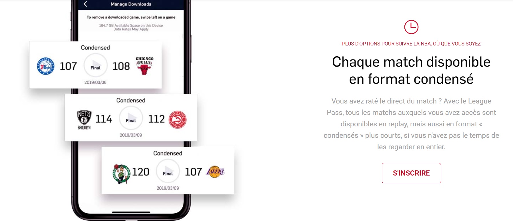 Outre l’intégralité des rencontres des 30 franchises (1230 matchs de saison régulière+ playoffs et finales), le NBA League Pass International offre une multitude de services adaptées aux habitudes de consommation comme suivre plusieurs matchs en même temps, visionner les résumés condensés, un zoom pour le visionnage sur mobile, de la réalité virtuelle, etc.