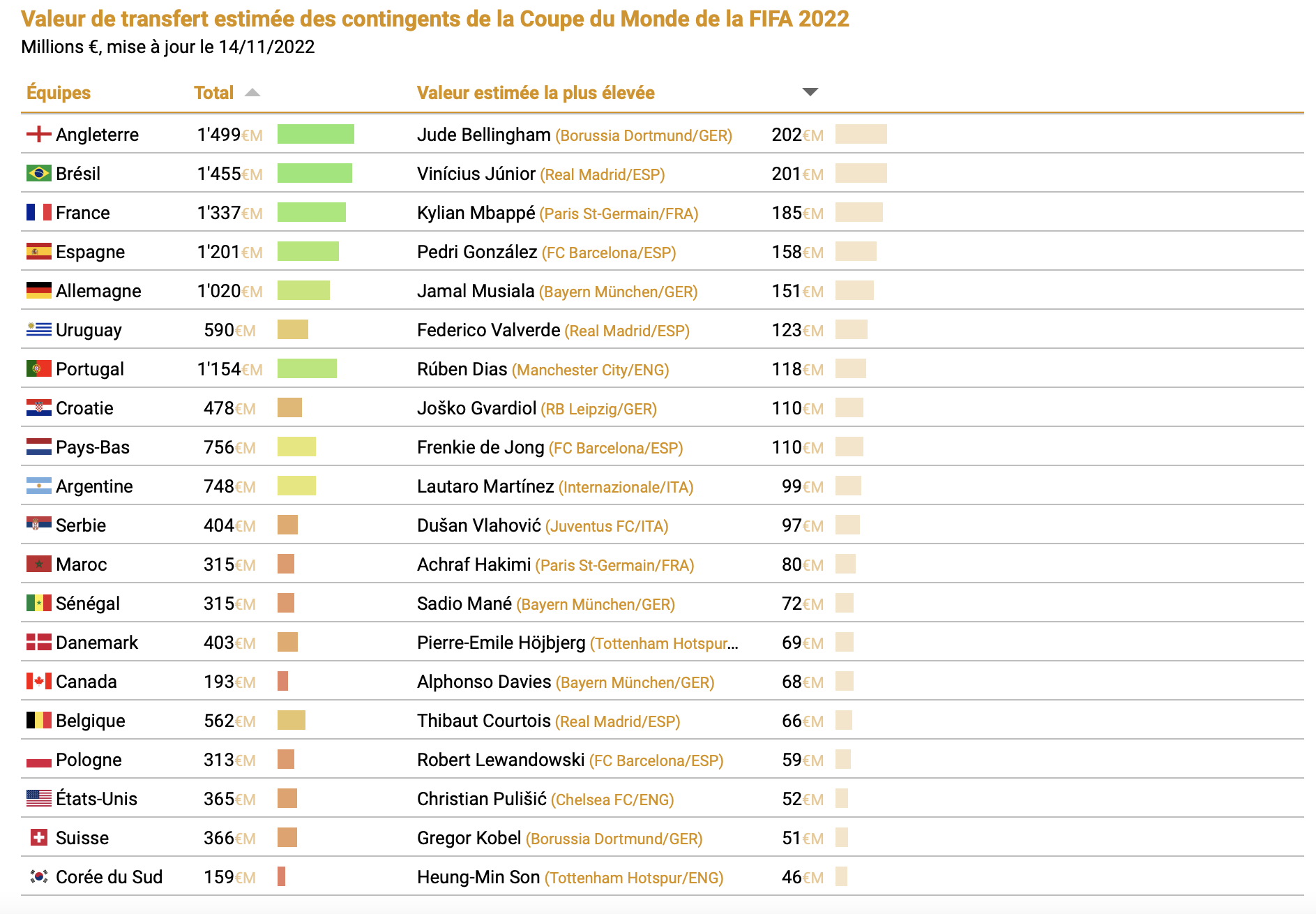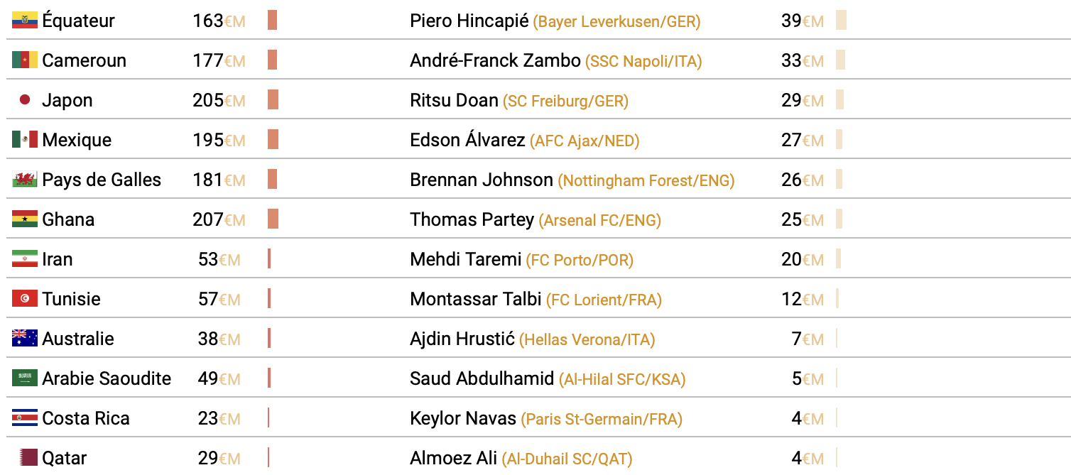 On notera que le Costa Rica est la nation avec le total le plus faible avec 23 millions d’euros, juste devant le Qatar qui détient un effectif valorisé à 29 millions d’euros.