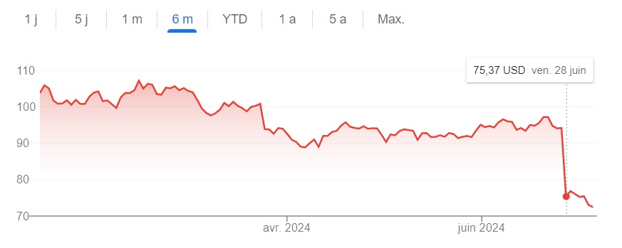 L’annonce des résultats financiers 23-24 de Nike Inc ont évidemment eu une incidence directe sur le cours du groupe à la bourse. Dès l’annonce, vendredi 28 juin, l’action de Nike a chuté de 20% à 75,37$. Une perte de 28 milliards de dollars de capitalisation boursière qui est passé de 142 milliards de dollars à un peu moins de 114 milliards de dollars. Depuis, le cours a continué sa baisse.