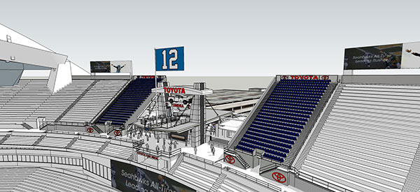 Le « Toyota Fan Deck » sera composé de deux tribunes (en bleu sur le dessin ci-dessous) et de l’espace accueil placé au milieu. Un dispositif qui devrait être disponible à temps pour la prochaine saison et qui viendra offrir et enrichir l’expérience des futurs abonnés des Seahawks à cet emplacement. « Le Toyota Fan Deck va offrir une expérience enrichie au 12ème homme et nous permet de répondre à une demande croissante de tickets » a précisé Peter McLoughlin, le président des Seahawks.