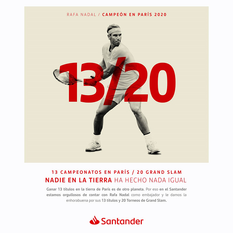 De son côté, la banque Santander, sponsor de Rafael Nadal depuis le début d’année, célèbre ce nouveau titre en offrant notamment une raquette et une tenue dédicacée par le tennisman espagnol.