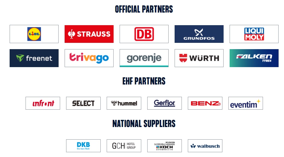 Pour cet Euro 2024 de handball, les sponsors sont Lidl, Strauss, DB, Grundfos, LiquiMoly, Freenet, Trivago, Gorenje, Wurth, Falken, Josera, Infront, Select, Hummel, Gerflor, Benz, Eventim, DKB, GCH, Koch et Walbusch.