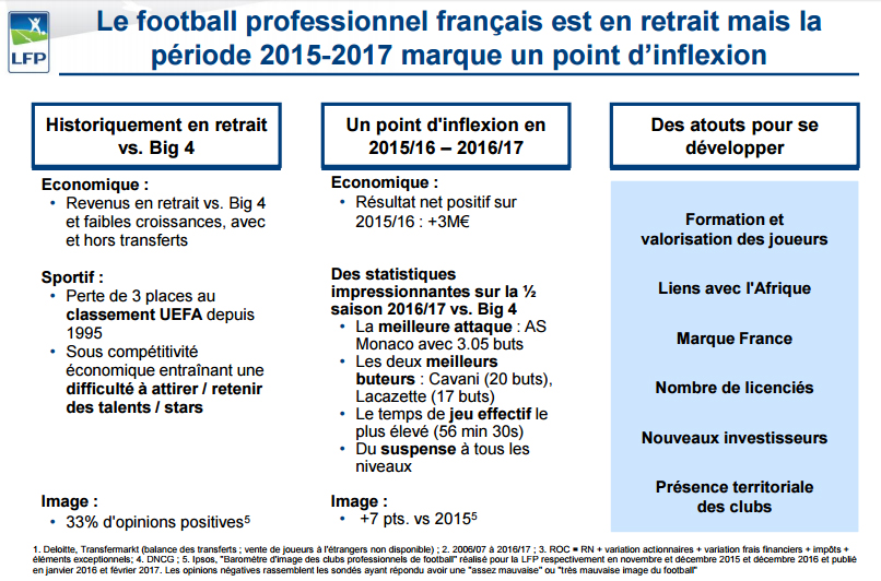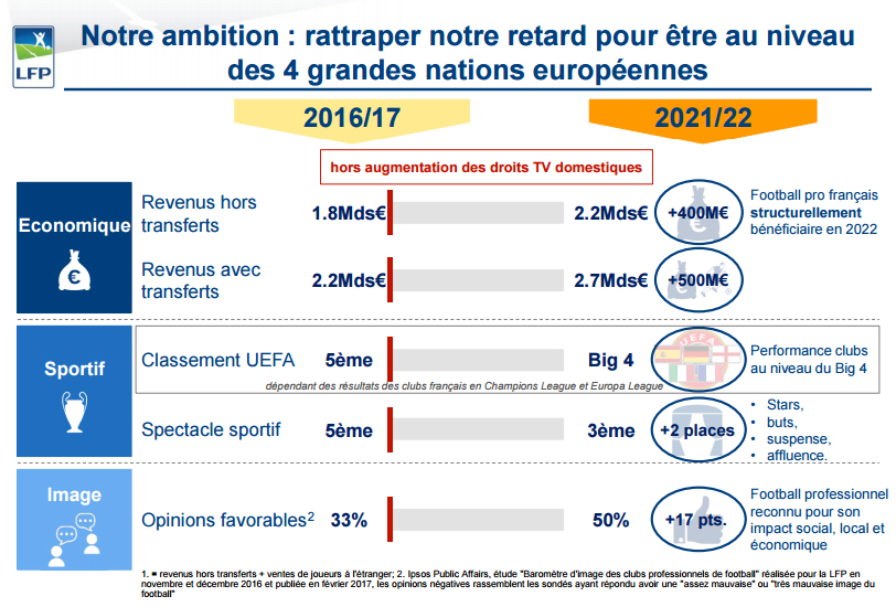 L’objectif ? Rattraper le retard économique et sportif par rapport aux autres championnats de football européen afin de faire de la Ligue 1 un produit et une marque mondiale.
