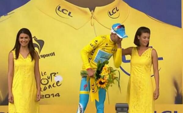 Lors de la seconde étape du Tour de France 2014 dimanche dernier, l’une des hôtesses du podium Maillot Jaune LCL, Marie-Alexie Bazerque, a déclenché un petit buzz en mettant un vent au coureur Vincenzo Nibali. La jeune hôtesse avait ainsi tourné la tête au moment où le coureur s’apprêtait à lui faire la bise. David Opoczynski, journaliste pour Le Parisien – Aujourd’hui en France, a voulu en savoir plus et a interrogé l’hôtesse qui a accepté de revenir sur cet insolite de début de Tour.