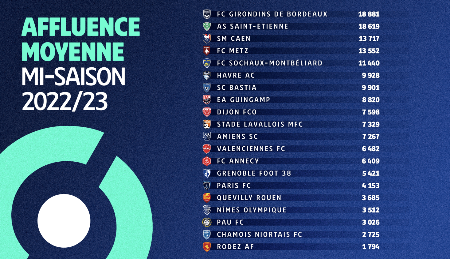 Les clubs « habitués » à la première division comme Bordeaux, Saint-Étienne, Metz, Caen ou encore Sochaux rassemblent plus de 10 000 spectateurs par match. Pour la première moitié de la saison, un club de Ligue 2 BKT détient en moyenne 4 100 abonnés. Par ailleurs, la vente de billets à l’unité a augmenté de 78%.