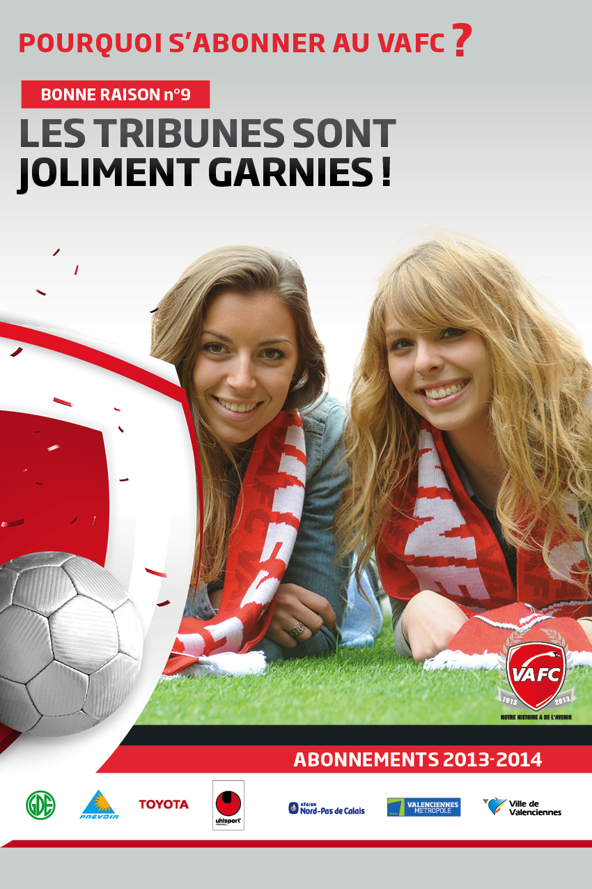 Il y a quelques semaines, le Valenciennes Football Club (VAFC) a lancé sa campagne d’abonnement pour la saison 2013/2014. « Nous travaillons sur la définition de l’offre depuis fin février. Concernant la campagne de communication, nous avons attaqué vers le mois d’avril. Avant de lancer définitivement la campagne, comme beaucoup de clubs, nous sommes obligés d’attendre de savoir quel championnat nous allons disputer la saison prochaine » nous a précisé Christophe Hugot, Responsable Commercial du club. Pour attirer un public nombreux et s’attaquer aux différentes cibles (abonnés, familles, femmes, adolescents…) le club a décliné graphiquement 15 bonnes raisons de s’abonner pour la prochaine saison. Découvrez ci-dessous quelques unes des plus farfelues ! ;-)
