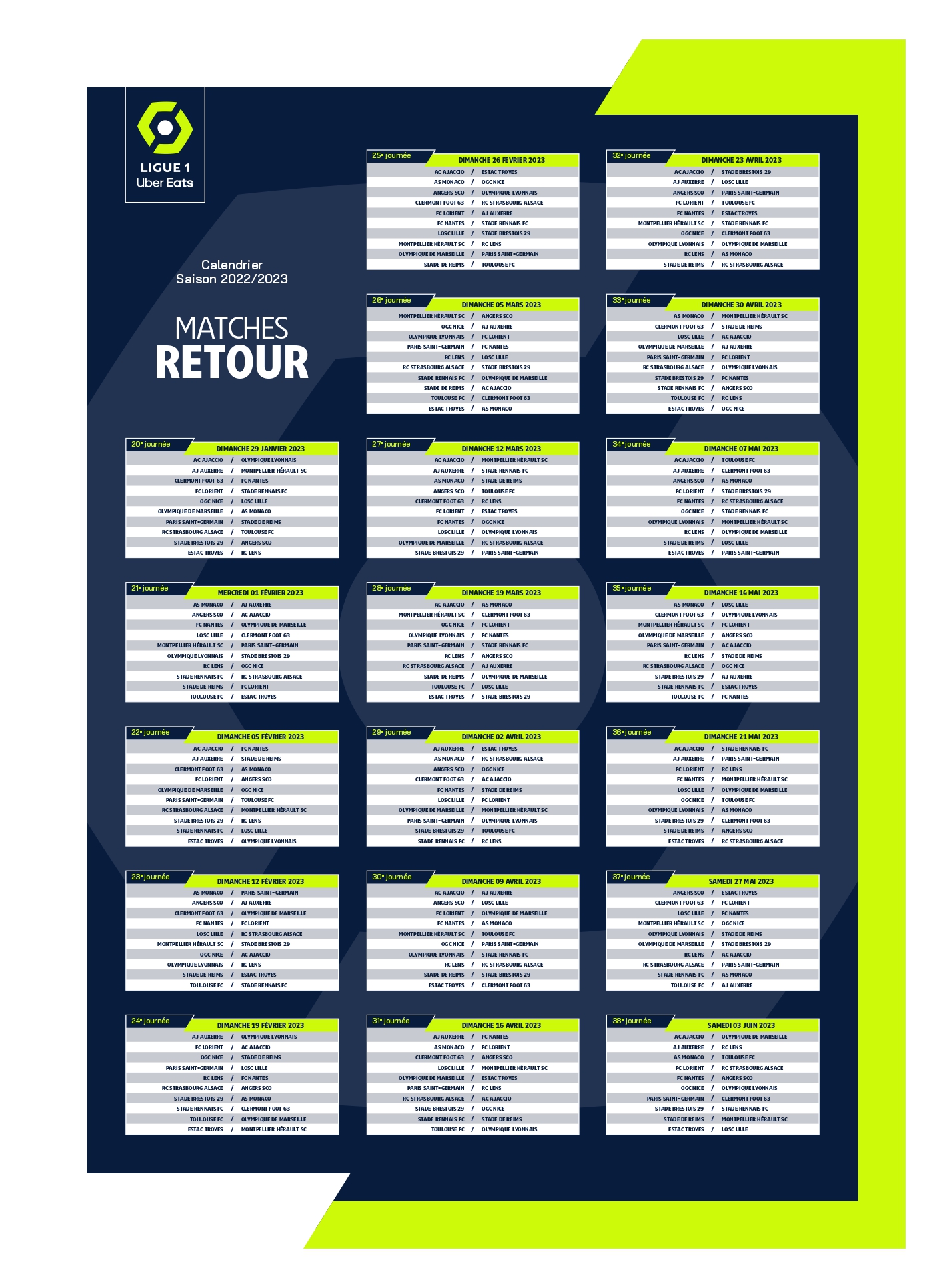 Calendrier matchs aller – retour Ligue 1 Uber Eats (saison 2022-2023)