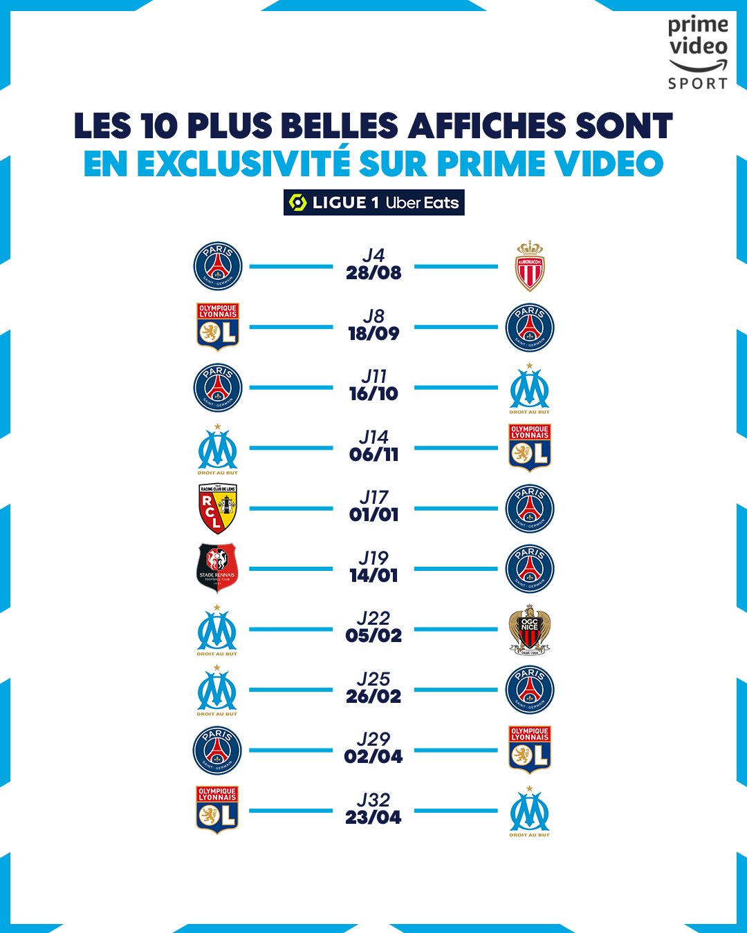 Détenteur des principaux lots de la Ligue 1 Uber Eats depuis la saison dernière, Prime Vidéo a profité de la publication du calendrier 22-23 pour annoncer les 10 affiches qui seront diffusées sur ses antennes en exclusivité sur la case du dimanche soir.