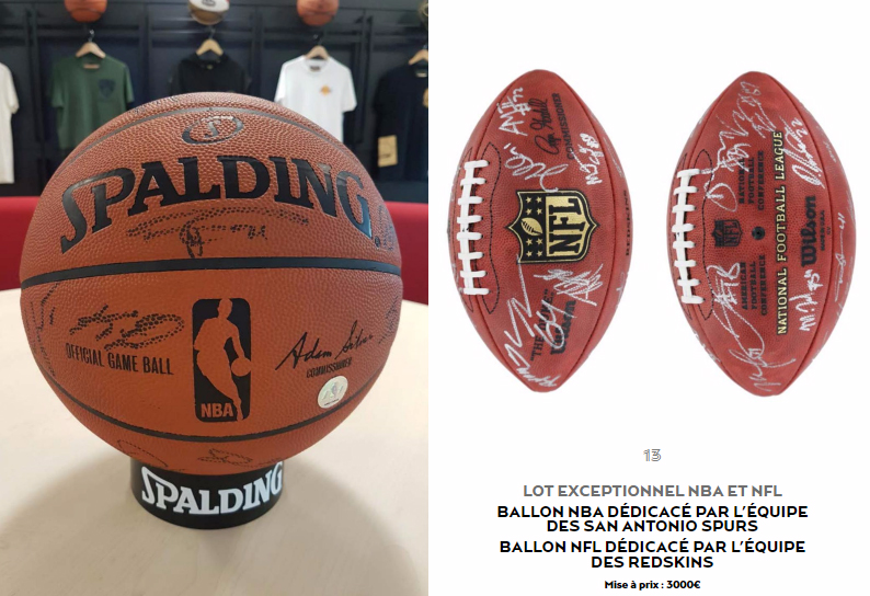 Un lot NBA et NFL comprenant un ballon NBA dédicacé par l’équipe des San Antonio Spurs et un ballon NFL dédicacé par l’équipe des Redskins