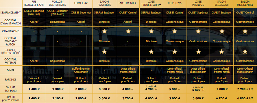 Stade évolutif (de 15 à 35 000 personnes), le Matmut Stadium de Gerland propose 2 300 sièges VIP, 5 salons et 28 loges. Le club du LOU Rugby propose ainsi 10 niveaux de prestations allant de 1 400€ HT à 7 200€ HT par personne pour une saison (13 matchs de TOP 14 + 3 rencontres européennes). Pour une loge privative de 12 personnes en tribune SERFIM, comptez entre 50 000 et 56 000€HT la saison.