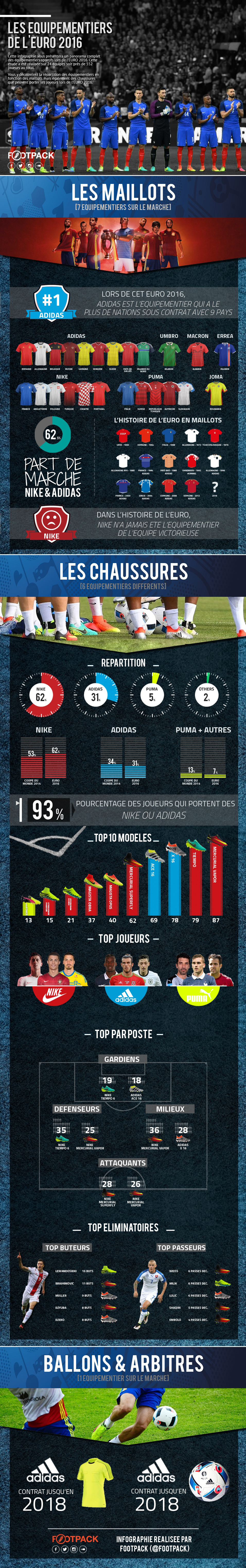 A quelques jours du début de l’UEFA Euro 2016, Footpack fait le point sur les équipementiers chaussures et maillots de la compétition. Une infographie complète à retrouver ci-dessous.