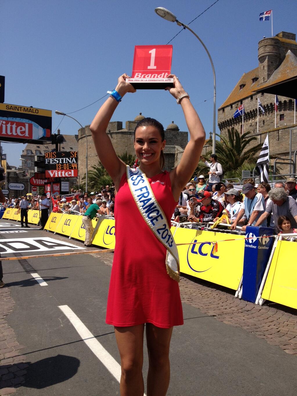 Aujourd’hui, la Miss France 2013 Marine Lorphelin se glisse dans la peau d’une Hôtesse du Tour de France 2013 ! En plus du traditionnel Prix Brandt de la Combativité remis tous les jours au combatif du jour, Brandt décernera un prix exceptionnel à forte symbolique en s’associant avec Miss France et l’association Mécénat Chirurgie Cardiaque : Le MINI prix Brandt de la Combativité. Marine Lorphelin remettra ce prix à un enfant souffrant de maladie cardiaque.