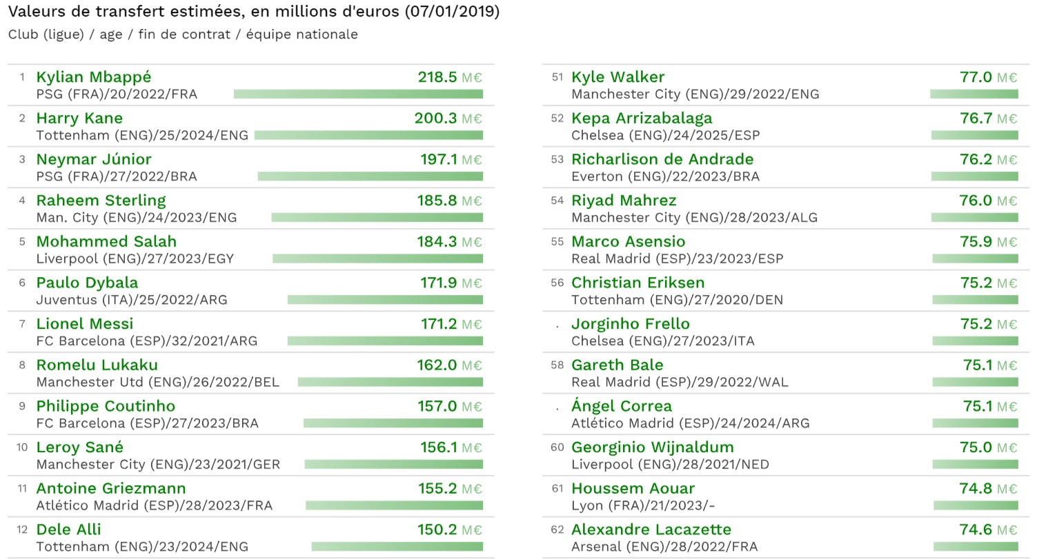 En 2019, le classement des joueurs les plus chers des cinq grands championnats, publié par le CIES, a évolué, notamment à la première place. Kylian Mbappé, auteur d’une grande saison couronnée d’un titre de champion du monde, et âgé seulement de 20 ans, caracole désormais en tête avec une valeur de transfert estimée à 218,5 millions d’euros. Un montant supérieur de 38,5 millions d’euros au prix auquel il avait été acheté par le PSG à l’AS Monaco (180 millions d’euros). Le prodige français passe ainsi de la 4ème place à la première. Il devance l’attaquant anglais de Tottenham, Harry Kane, et son coéquipier Neymar, premier l’an dernier, qui valent respectivement 200,3 et 197,1 millions d’euros.