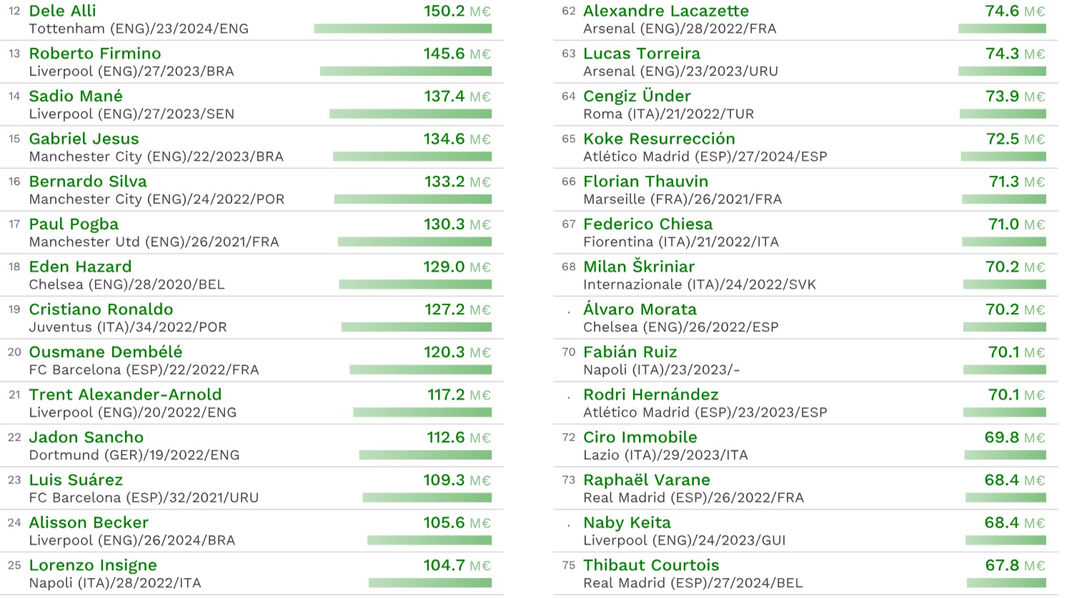 Alors qu’Antoine Griezmann et Paul Pogba l’accompagnaient la saison dernière, Kylian Mbappé est désormais le seul tricolore au sein des dix premières places, malgré la victoire de la France à la Coupe du Monde 2018. Le joueur de l’Atlético de Madrid est passé de la 9ème place à la 11ème et le joueur de Manchester United de la 10ème position à la 17ème. Ousmane Dembélé est lui 20ème avec une valeur de 120,3 millions d’euros.