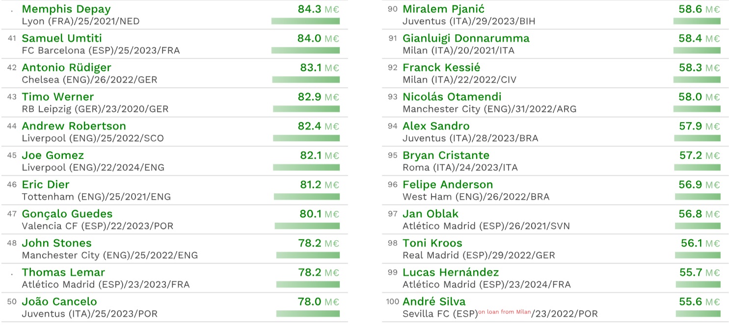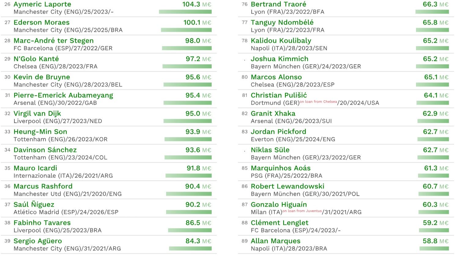Comme chaque année, le centre international d’études sportives (CIES) calcule la valeur marchande des joueurs des cinq grands championnats européens. Ces estimations sont basées sur l’âge, le poste, la durée du contrat du joueur dans son club, les performances récentes et les statuts internationaux.