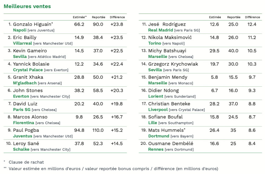 Et pour l’Observatoire du football CIES qui a étudié les sommes dépensées (bonus compris) et les montants estimés des joueurs grâce à son algorithme, c’est le transfert de Gonzalo Higuain qui représente la meilleure vente d’un club lors du dernier Mercato.