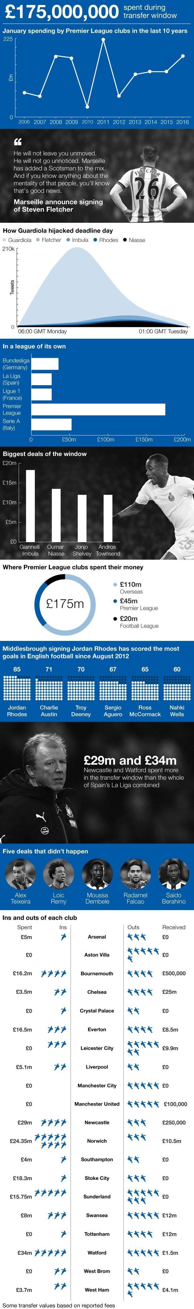 « Les clubs de Premier League ont décidé de dépenser significativement dans ce mercato hivernal qui enregistre un record depuis 5 ans » a commenté Dan Jones pour Sports Business Group au cabinet Deloitte. En effet, le dernier mercato hivernal le plus dépensier des clubs de Premier League était celui de janvier 2011 avec 225M£. Les trois clubs les plus dépensiers sont Newcastle, Norwich City et Watford qui représentent au total environ 40% des dépenses cet hiver par les clubs de Premier League selon Deloitte. Au total, les 14 derniers mercatos hivernaux de Premier League ont générés 1,4 milliard de livres (1,8 milliard €) d’achat de joueurs.