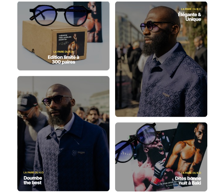 Baptisées « La Paire du KO », les lunettes sont fabriquées avec une monture en acétate compressé. Une collection spéciale qui met en avant quelques punchlines comme « vérifie tes angles morts » ou encore « je vous avais dit quoi ? ». Un code promo de -10% avec « KO10 » a été partagé par l’athlète sur ses réseaux sociaux.