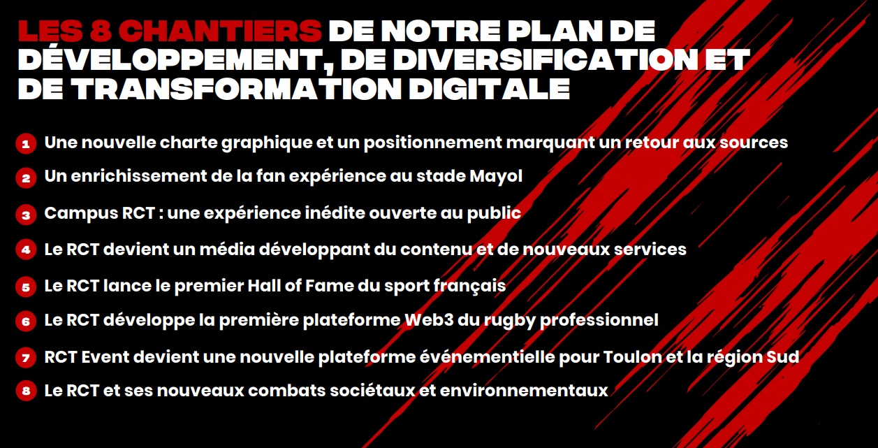 « Séduire et engager toujours plus de fans implique de gagner des titres, mais aussi de fédérer autour de nos joueurs, de notre identité, de nos valeurs et ainsi se muer en plateforme événementielle et digitale proposant du contenu, des expériences fortes et des services » précise François Pesenti, Directeur Exécutif du RCT. « Un grand club professionnel, comme le Rugby Club Toulonnais, est aussi une entreprise de divertissement et un média.