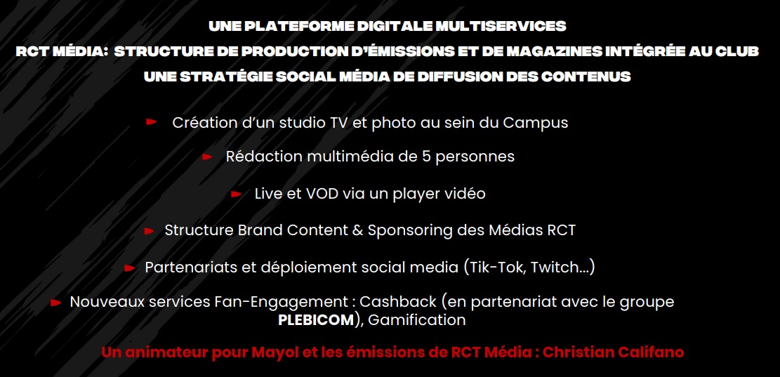 Des ambitions qui sont également accompagnées par la volonté d’inscrire un peu plus le club comme un média à part entière. Une structure de production d’émissions sera notamment intégrée au club avec une équipe de 5 personnes. Christian Califano incarnera les productions du club comme animateur.