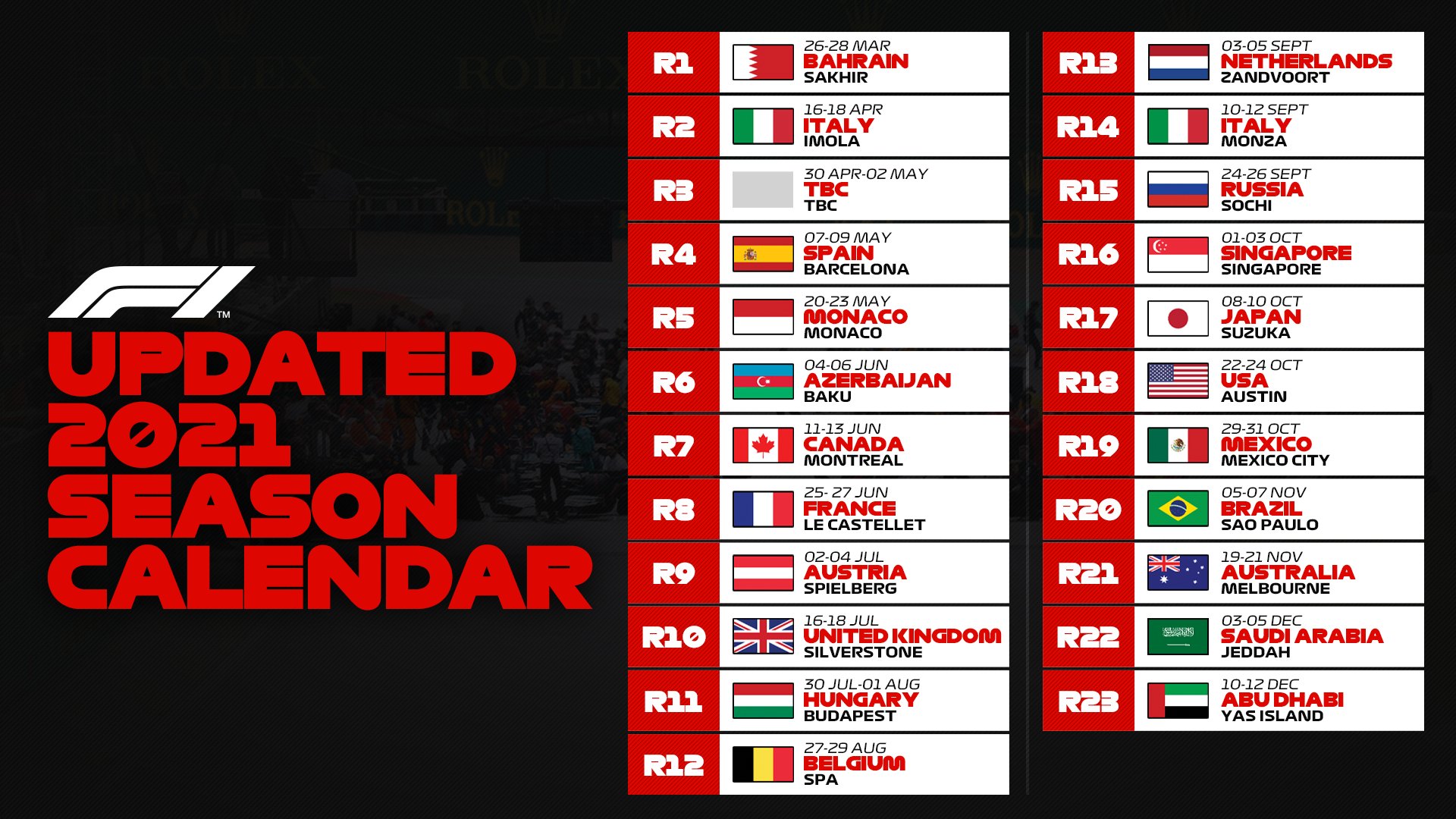 Formule 1 – Calendrier Officiel 2021