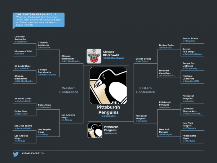 Alors que les Playoffs de NBA et de NHL ont commencé la semaine dernière, Twitter a simulé l’issue des séries en se basant sur le nombre de mentions faites des différentes franchises sur le site lors de la saison régulière. Ainsi, Miami Heat remporte les « Playoffs 2014 Twitter NBA » en dominant en finale les Houston Rockets. En NHL, ce sont les Pittsburgh Penguins qui soulèvent la Coupe Stanley des mentions Twitter en dominant en finale les Chicago Blackhawks !