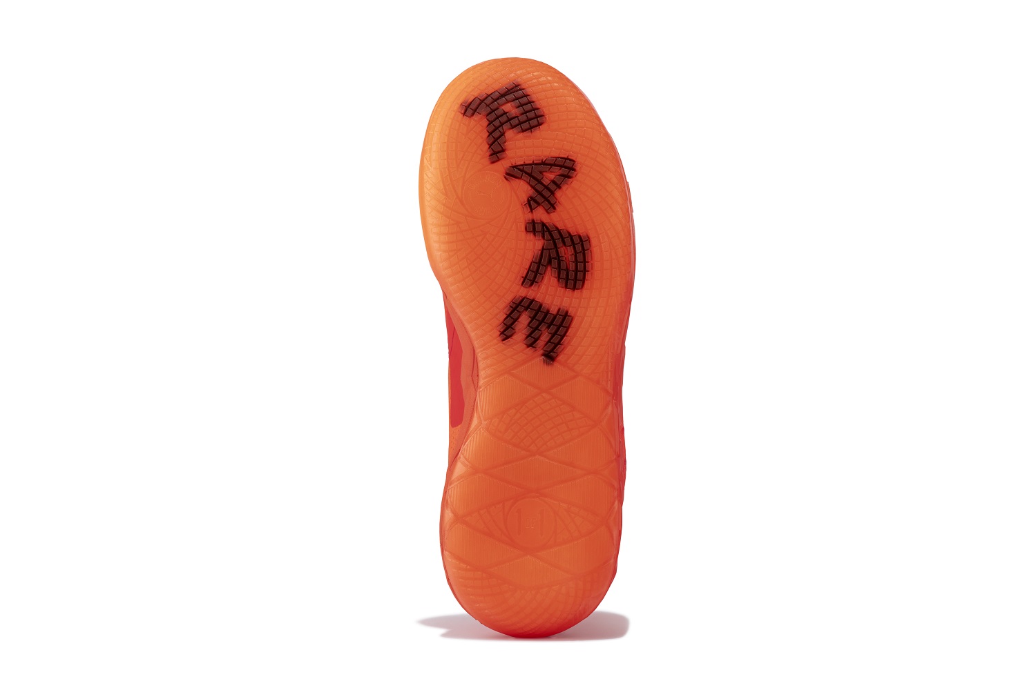 « La MB.01 a été conçue par LaMelo, qui a incorporé son style personnel dans toute la chaussure, des choix de couleurs audacieux aux détails uniques et complexes. On retrouve un contour artistique de flammes qui descendent du col de la cheville et s’alignent sur le célèbre tatouage de Melo à la cheville. La languette de la chaussure comprend la mention « Not from Here » de LaMelo et la semelle extérieure met en évidence le mot « RARE », synonyme de son talent sur les parquets » précise le communiqué.
