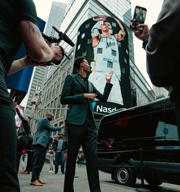 En marge de la soirée de la Draft, Victor Wembanyama a pris la pose à New York devant des écrans publicitaires à son effigie et celle de son partenaire Fanatics (qui détient notamment les cartes Topps).