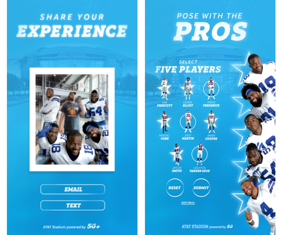 La première et la plus médiatisée des activations lancée depuis le début de la saison se nomme « Pose with The Pros ». Sur des écrans tactiles installés dans les travées du stade, les fans des Cowboys sont invités à prendre une photo aux côtés de joueurs que l’on peut sélectionner (Ezekiel Elliott, Jaylon Smith, Randall Cobb, Amari Cooper, …). Un dispositif de réalité augmentée (AR) qui offre une expérience plutôt qualitative à en croire les premiers retours sur les réseaux sociaux.