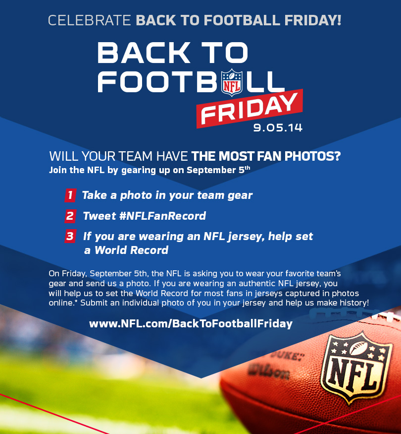 Hier la NFL était de retour avec le kickoff 2014 donné par la rencontre entre les Seahawks de Seattle et les Packers de Green Bay. Pour célébrer cette rentrée, la NFL invite les Fans à prendre part à un record du monde (Guinness World Record), celui du plus grand nombre de photos de maillots présents dans un album photo virtuel ! Jusqu’à demain, les Fans peuvent envoyer leur photo en maillot NFL via le hashtag #NFLFanRecord ou via le site NFL.com/backtofootballfriday.