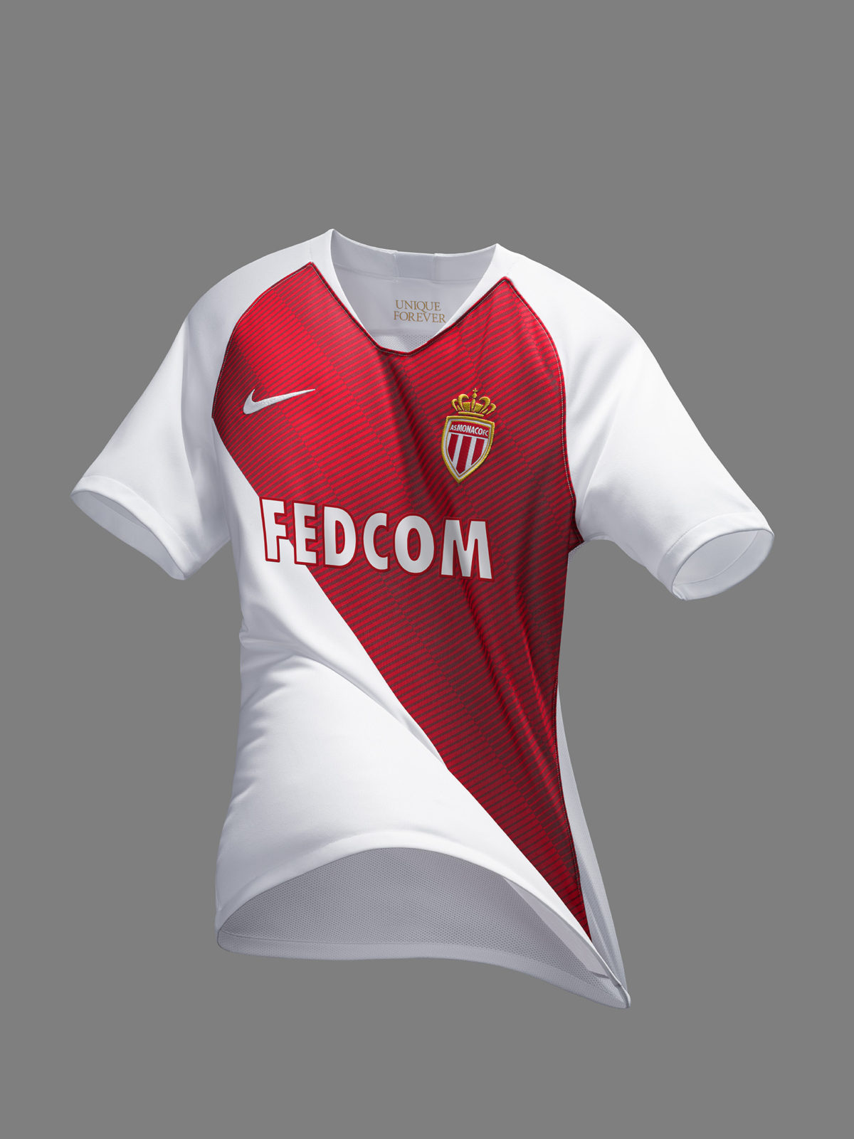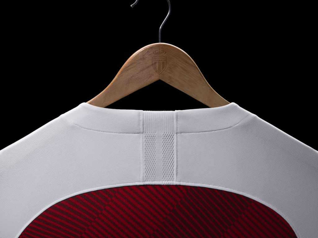 Blanc et rouge avec sa célèbre diagonale, le maillot du club monégasque est agrémenté de rayures dans les tons rouge et arbore un col en V. A l’intérieur du maillot, les fans retrouveront la devise du club « Unique Forever » écrite en doré.