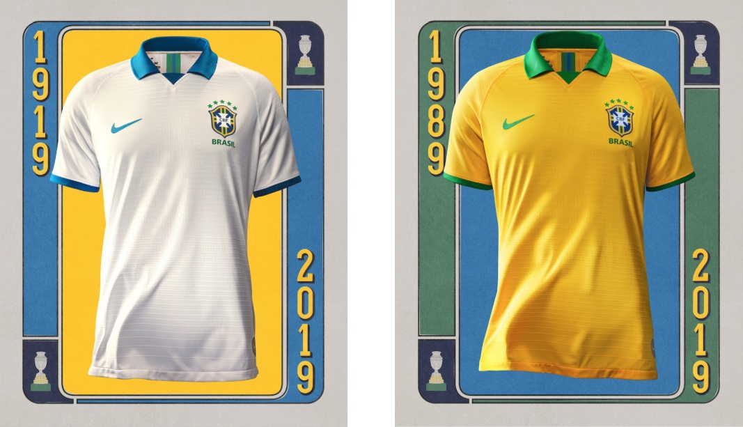 En 1919, le Brésil remportait la première édition de la Copa America. Une victoire remportée sur ses terres dans un maillot blanc. Pour célébrer les 100 ans de ce titre, Nike a décidé de rendre hommage à ce kit en proposant un troisième maillot anniversaire blanc au look rétro avec col et autre détails – dont les numéros – en bleu. Un maillot qui sera porté par la sélection nationale lors du premier match du tournoi.