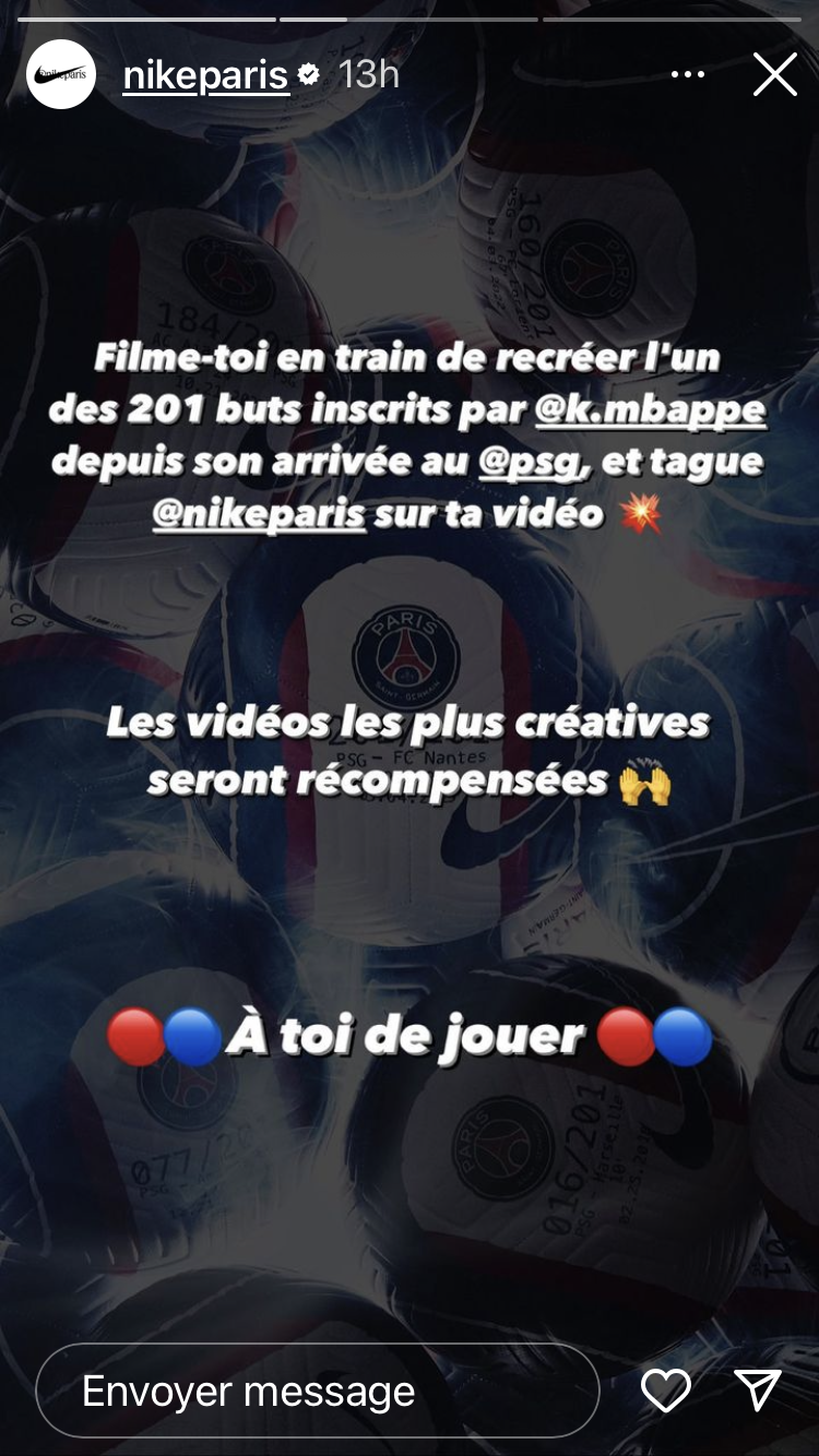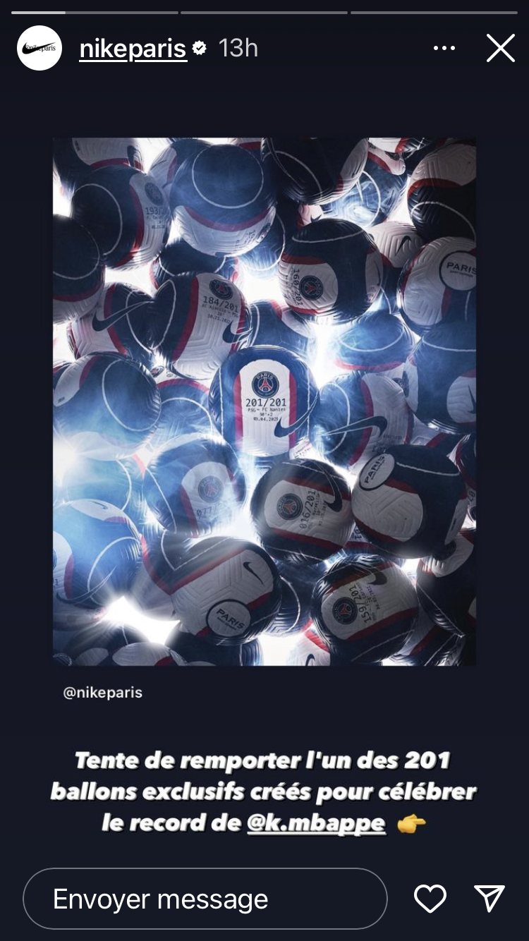 Toujours sur Instagram, le compte Nike Paris en a également profité pour organiser un concours spécial. La marque a ainsi créé 201 ballons numérotés aux couleurs du PSG qu’il sera possible de gagner en recréant l’un des 201 buts de Mbappé.