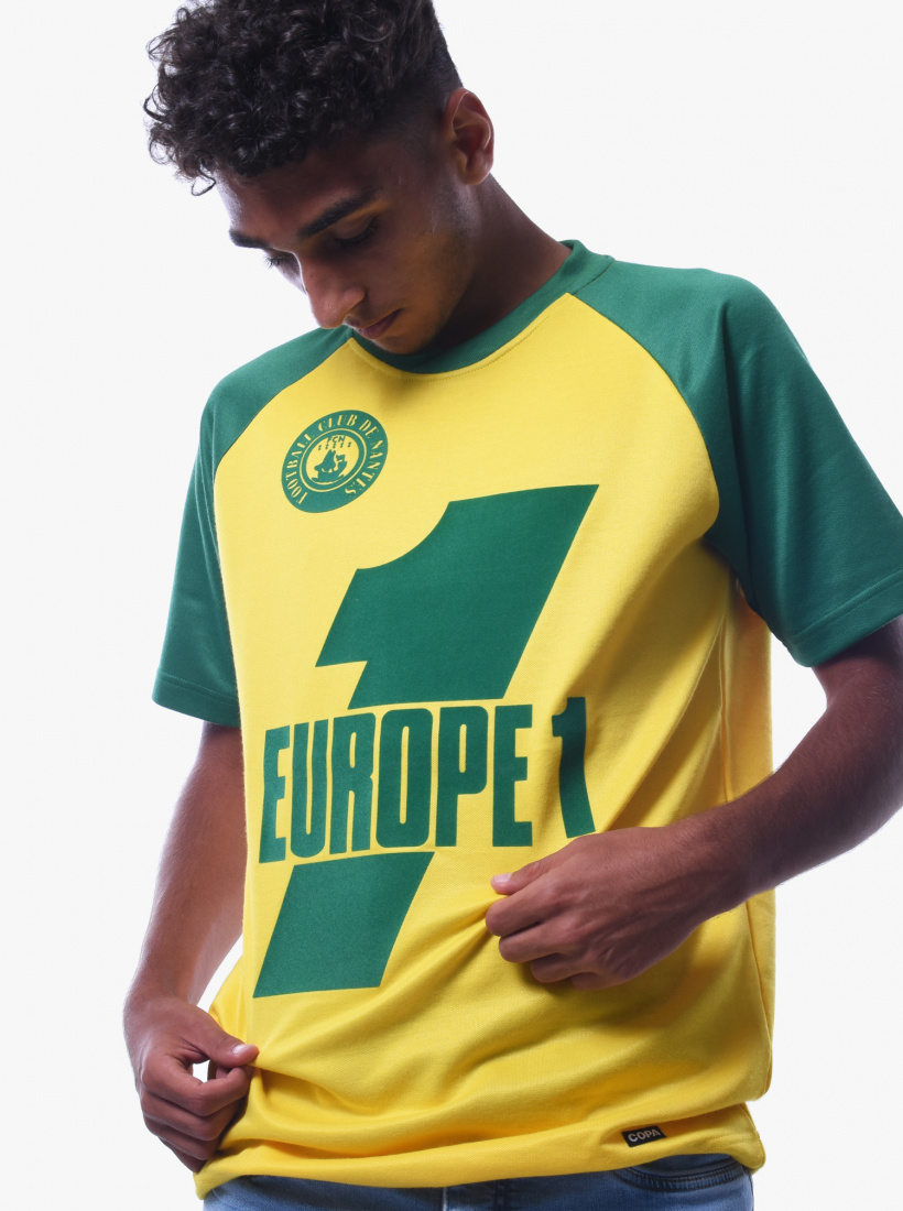 Restons dans le vintage avec ce très beau maillot proposé sur le site du FC Nantes. Il s’agit là de la tunique « Europe 1 » portée par les Canaris lors de la saison 1978/1979, couronnée d’un cinquième titre de champion de France.