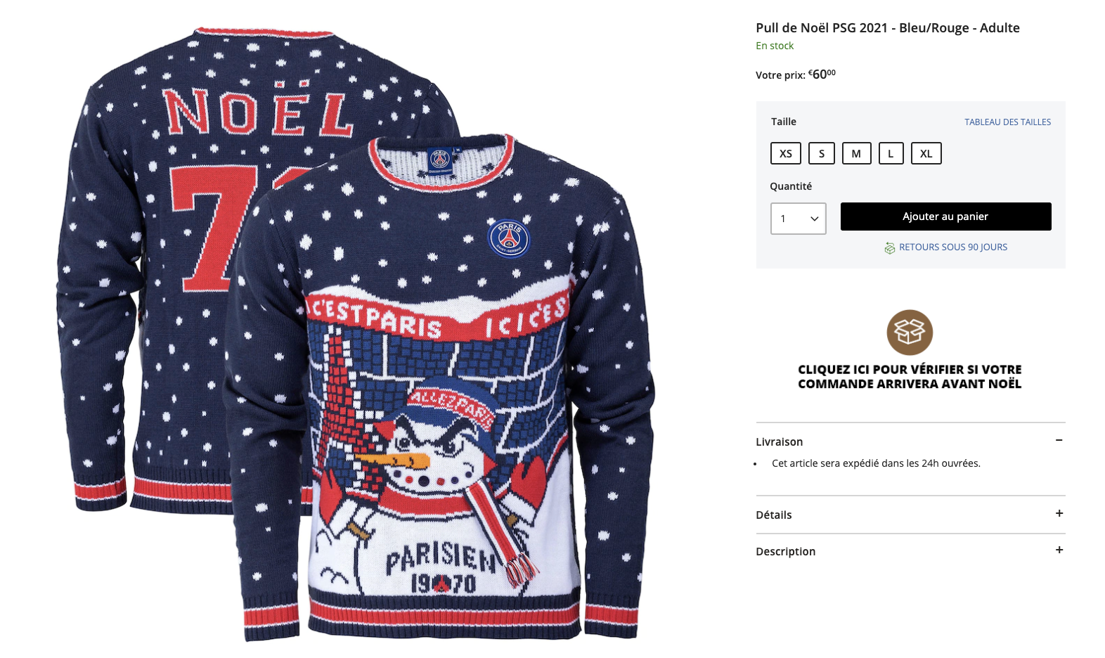 On vous imagine déjà, votre pull PSG sur le dos, chocolat chaud à la main, blotti sous un plaid en train de regarder le multiplex Ligue 1 du dimanche après-midi (sans votre club favori). Sur le devant, un bonhomme de neige tire la gueule comme après une prestation loupée des Parisiens en Ligue des champions. Derrière, le pull est floqué « Noël 70 » (en référence à l’année de création du club). Prix du tricot : 60 euros.