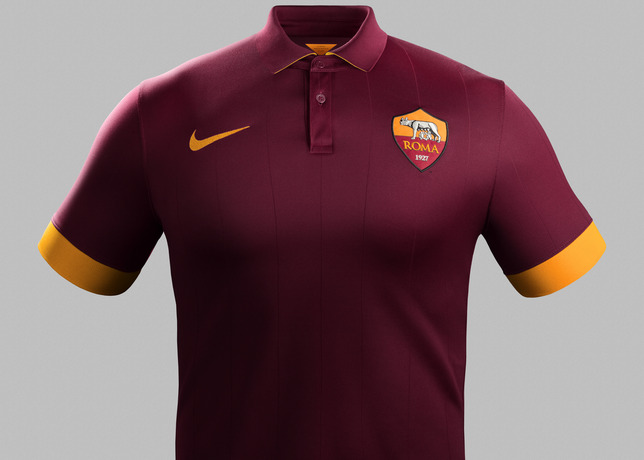 Un an après l’annonce de la signature d’un partenariat de 10 ans entre Nike et l’AS Roma, le club italien et l’équipementier américain dévoilent aujourd’hui le look du nouveau maillot domicile 2014/2015. Ce nouveau maillot est donc le premier de l’AS Roma sous les couleurs de Nike. Les fans du club romain ne seront pas déboussolés puisque ce nouveau maillot reste fidèle aux couleurs du club. Façon polo avec col et boutons, le maillot arbore un rouge pourpre et jaune or. A l’intérieur du col, les fans retrouveront la phrase « La Roma Non Si Discute Si Ama » qui signifie « Rome est aimé sans aucune discussion« .