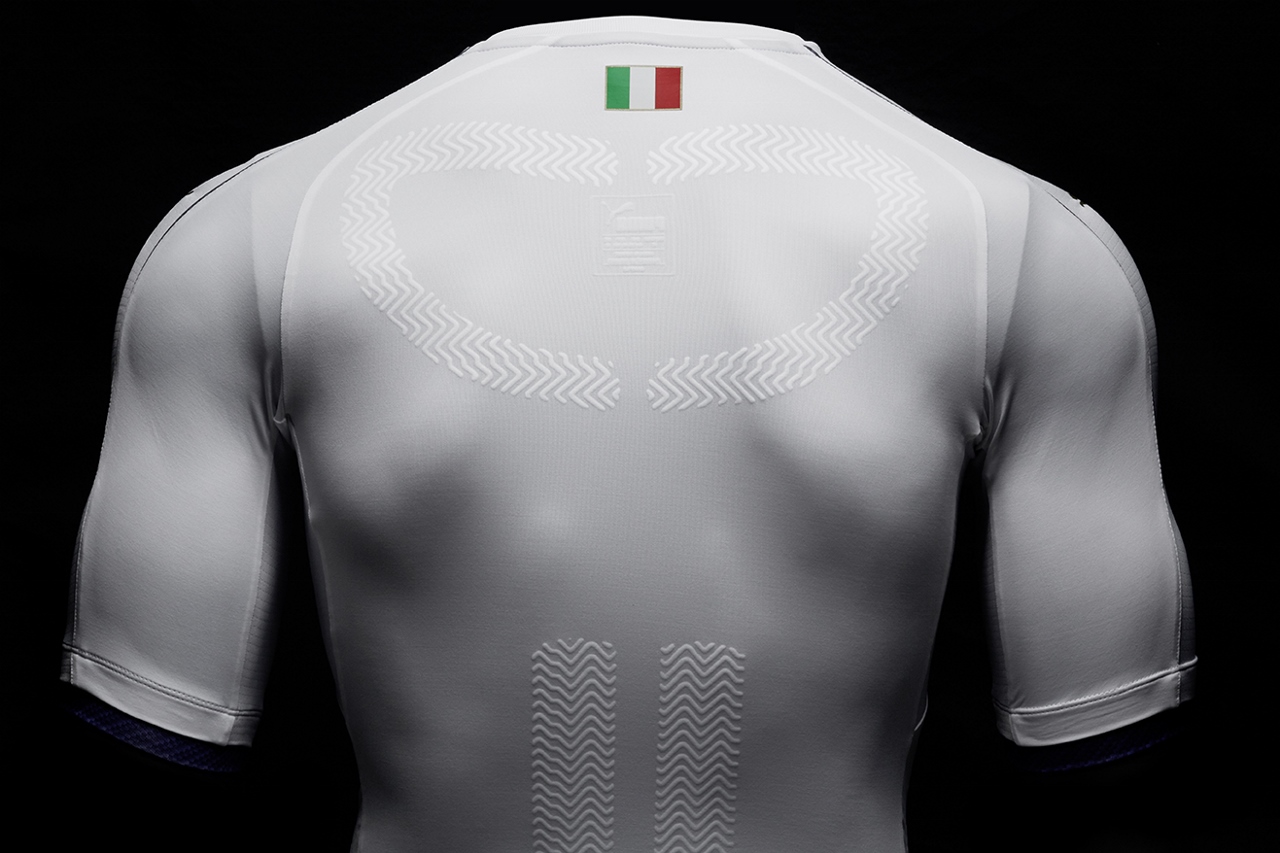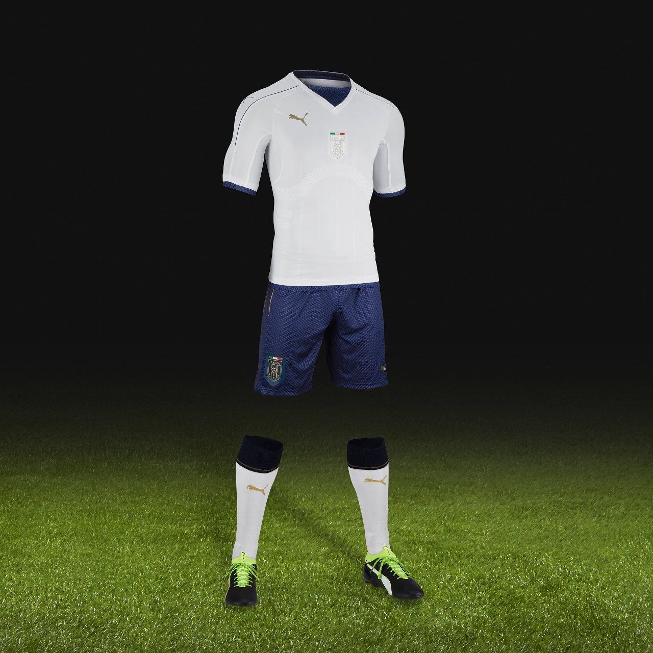 Cette nouvelle tenue extérieure de Puma fait honneur au blanc « traditionnel » avec un col en V bleu marine. Un imprimé subliminal en fibre de carbone habille les manches et le bas du maillot. Sur la poitrine, un imprimé jacquard structuré s’inspire du logo FIGC, qui conserve intact l’esprit transalpin. Des manches plus longues parachèvent ce look moderne et élancé. Un maillot qui arbore une conception similaire au maillot extérieur de 2006 afin de marquer le 10ème anniversaire de la victoire de l’Italie en finale de la Coupe du Monde contre les Bleus.