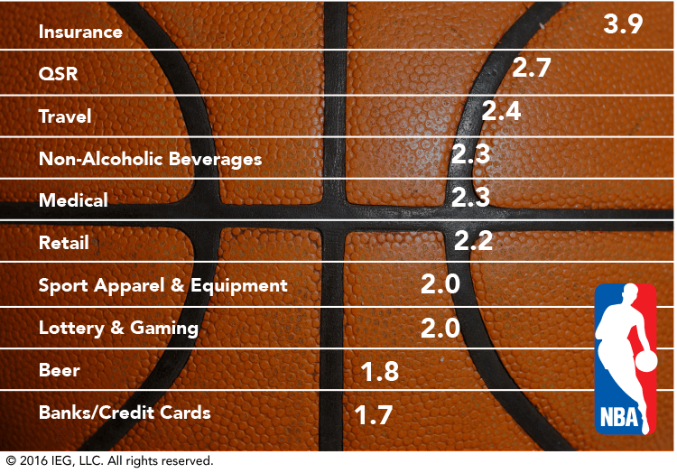 En regardant les secteurs d’activités les plus actifs dans le sponsoring sportif en NBA, on constate que les assurances trustent la première place devant les chaînes de restauration rapide (QSR). Les compagnies d’assurances parrainent 3,9 fois plus que la moyenne des autres sponsors.