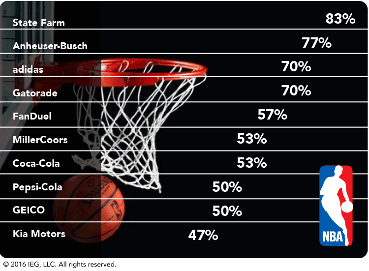 D’un point de vue des sponsors, le Top 10 n’évolue pas de manière transcendante même s’il faut noter que State Farm est devenue l’annonceur qui possède le plus grand nombre de franchises NBA puisqu’elle en couvre 83% et pique donc la premiere place au brasseur Anheuser-Busch (Budweiser, Bud Light) qui a récemment renouvelé son partenariat avec la NBA. Nous pouvons également noter l’arrivée de FanDuel, société de « Fantasy League » qui a pu trouver un accord avec 57% des franchises. adidas, équipementier de la ligue et des 30 franchises est également en partenariat avec 70% des franchises. Gatorade complète le TOP 5.