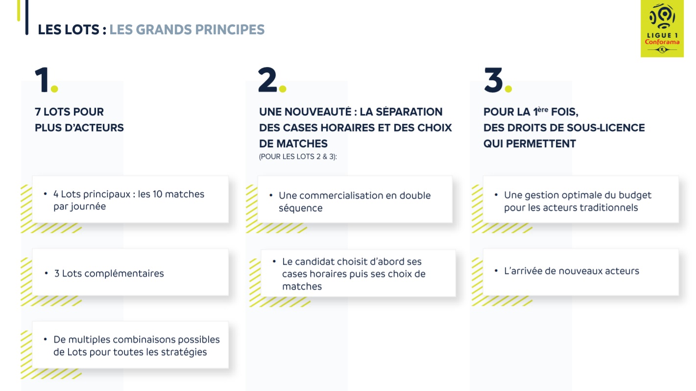 Au total, la LFP va proposer 7 lots. Du côté des nouveautés, le multiplex du samedi soir change de case pour arriver le dimanche à 15h. Un choix justifié par la ligue afin de « répondre aux besoins des clubs, augmenter le remplissage des stades et attirer de nouveaux publics ». En remplacement du multiplex du samedi soir qui débutait à 20h, un match sera programmé à 21h. « D’un point de vue marketing, on communique dorénavant sur 3 soirées prime time avec le vendredi soir et le dimanche soir » a précisé Didier Quillot, Directeur Général de la LFP lors de la conférence de presse.