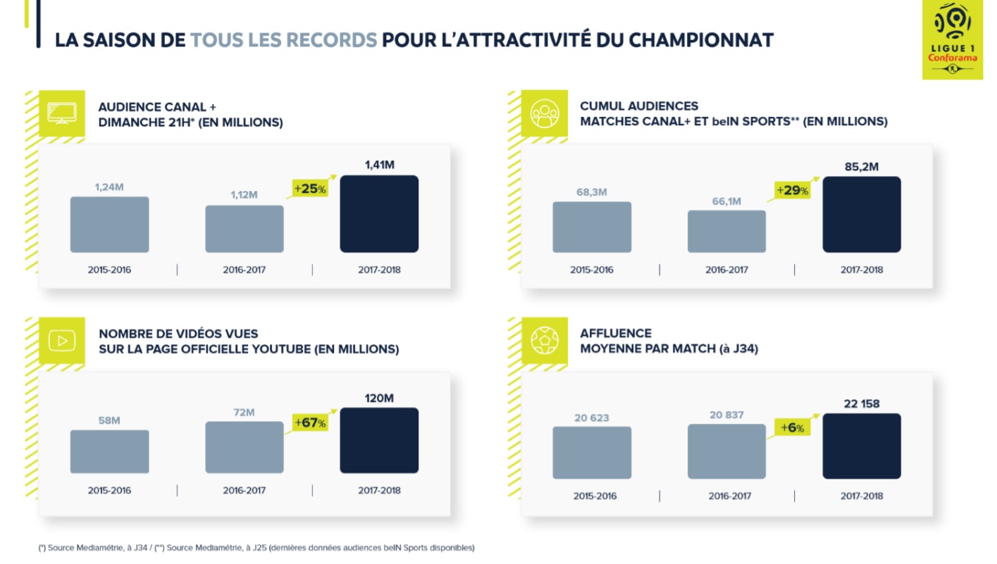 Pour vendre son produit Ligue 1, compétition de foot préférée des amateurs de foot en France, la LFP peut s’appuyer sur les derniers bons chiffres d’audience des chaînes Canal+ et beIN SPORTS. Sur la saison 2017-2018, les 25 premières journées de championnat ont cumulé un total de 85,2 millions de téléspectateurs. Un chiffre en hausse de 29% versus 2016-2017.