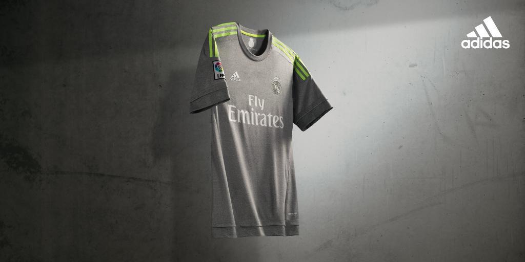 Pour le nouveau maillot extérieur 15/16 du Real Madrid, adidas mise sur un maillot gris (« Silver Glory ») coton lui donnant un look plus casual. Du jaune/vert fluo vient compléter cette tenue au niveau des trois bandes adidas ainsi que sur le short et les chaussettes.