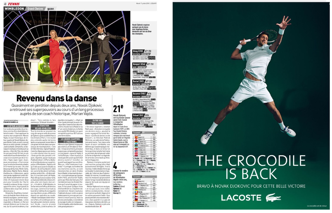 A cette occasion, Lacoste a tenu à célébrer cette victoire à Wimbledon avec une pleine page de publicité dans le journal L’Equipe et le titre « The Crocodile is back ».