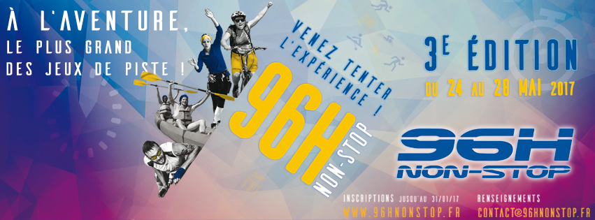 96h non-stop : A l’aventure, avec le plus grand des jeux de piste est un évènement organisé par l’Association OPTS. Il consiste à faire concourir 15 équipes de 4 personnes dans un parcours multi-disciplinaires où les épreuves s’enchaînent jour et nuit pendant … 96 heures ! Les équipes partent de Lyon, parcourent des centaines et des centaines de kilomètres et reviennent à Lyon 96 heures après … Mais durant le jeu, personne ne sait de quoi la prochaine épreuve sera faite ni où elle aura lieu : Jeux de piste, course d’orientation, Rafting, sports d’eaux-vive ou de montagne, randonnée, épreuves culturelles, quizs, épreuves solidaires, jeux de réflexion, Accrobranche et parcours aventure, Kayak, VTT, saut à l’élastique …. tout peut arriver ! Toutes les équipes sont en compétition mais la rapidité et les capacités physiques ne sont pas les seuls critères requis pour triompher : stratégie et réflexion sont aussi de la partie… La nuit, les équipes sont hébergées dans des campings ou hôtels, mais attention : une épreuve peut survenir à n’importe quel moment ! Tous les repas et l’hébergement sont inclus dans le programme, et l’aspect culturel n’est pas en reste puisque la découverte du patrimoine s’inscrit dans l’évènement