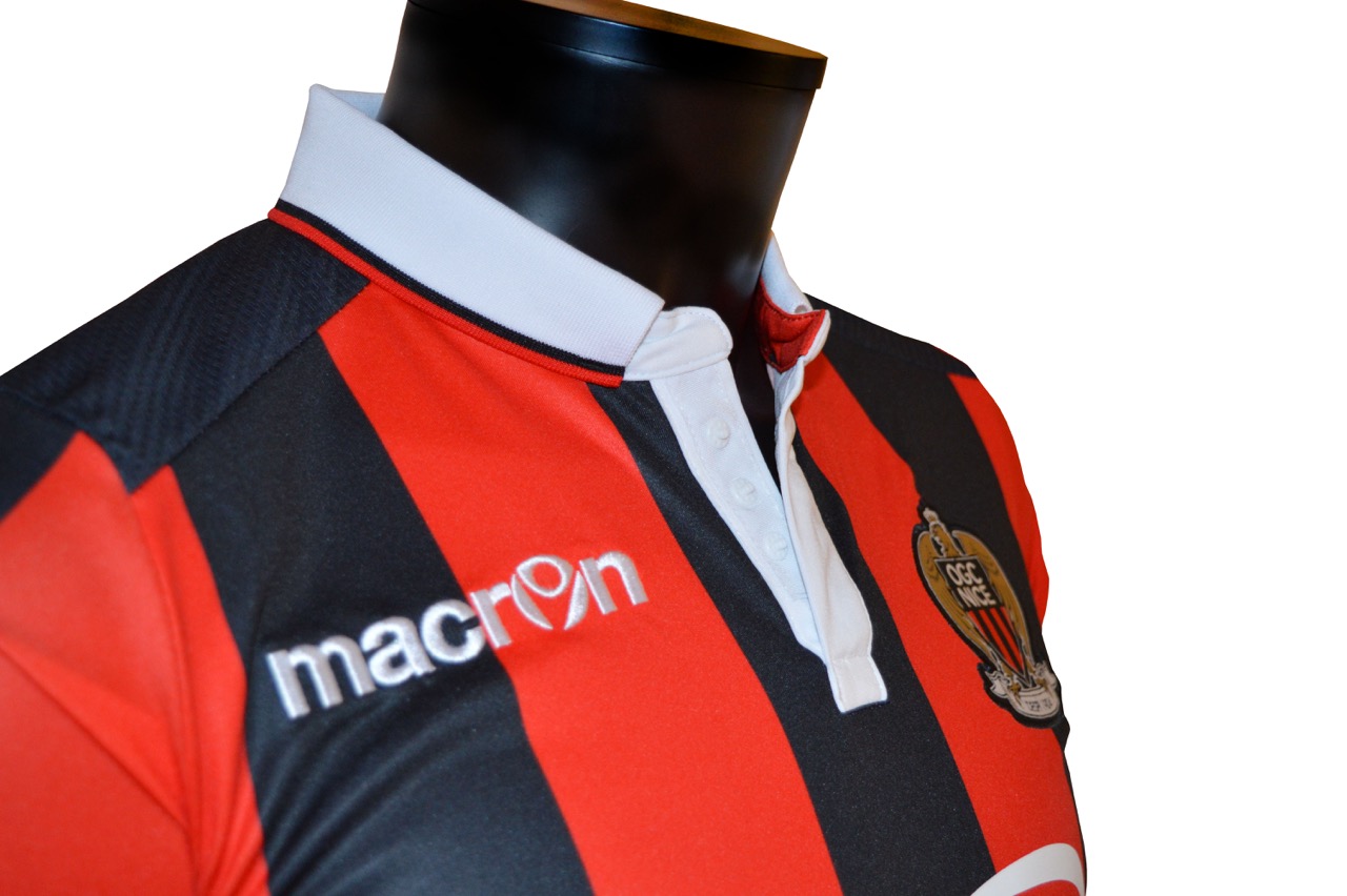 Marque italienne, Macron inscrit les nouveaux maillots de l’OGC Nice dans la plus pure tradition du Gym. A domicile, des rayures verticales rouges et noires magnifiées par un col et des retours de manches blancs, qui rappelleront à de nombreux supporters le maillot qui a accompagné les Aiglons lors de la saison de leur victoire en Coupe de France en 1997.