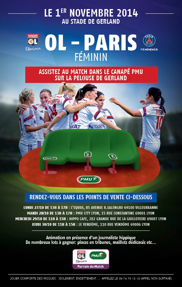 Samedi 1er novembre, le PMU sera le parrain du match choc de D1 féminine qui opposera l’Olympique Lyonnais au Paris Saint-Germain au Stade de Gerland. A cette occasion, le PMU va installer son célèbre canapé vert VIP en bord de pelouse et accueillera 4 privilégiés.