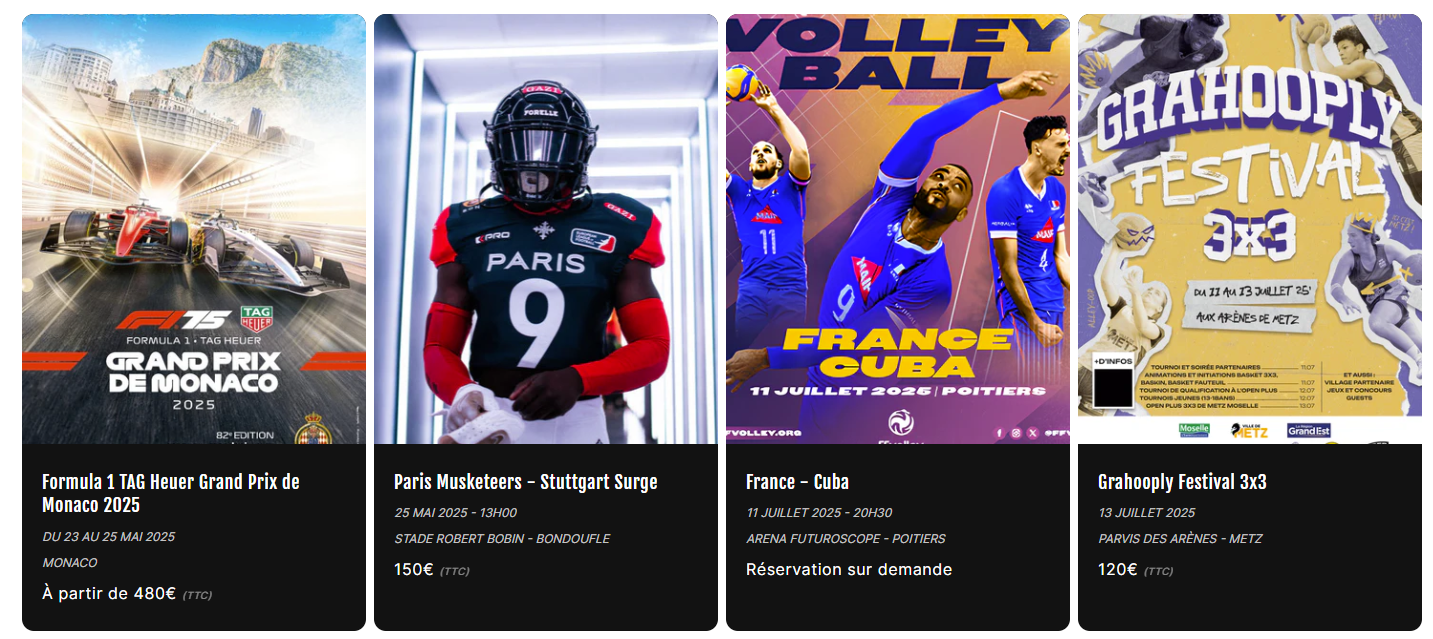 Pour la phase de lancement, le nombre d’événements est volontairement limité afin de permettre d’affiner au mieux nos process, d’écouter ce que peuvent nous dire les partenaires potentiels, nous proposons déjà de très beaux événements : le Grand Prix de F1 de Monaco, les rencontres des Paris Musketeers, les événements sportifs de l’Arena Futuroscope, les match du FC Grenoble Rugby et même un tournoi de basketball 3×3 à Metz. D’autres suivront très bientôt, durant l’été, ou pour la reprise de la saison. Et, à l’intérieur de ces événements, nous essayons de proposer tout ou partie de l’offre de l’organisateur.